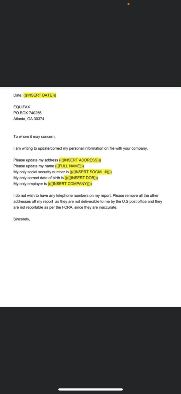 You will get 6 pages of letters to copy and past to send off to each credit bureau